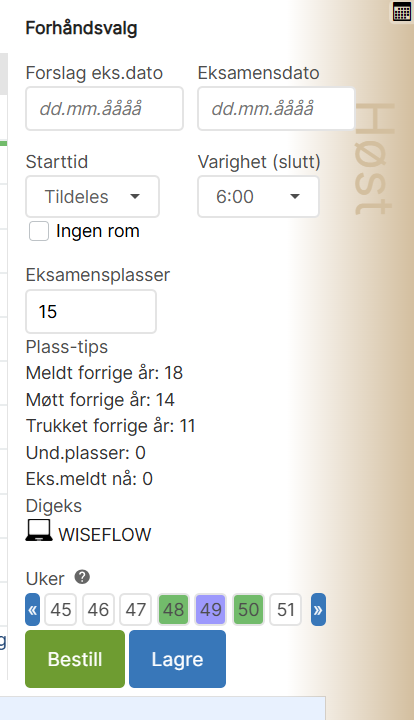 - Eksamensbestillinger i rom- rapport som viser hvilke rom eksamen er plassert på. Filtrering: emnekode/dato/rom/semester