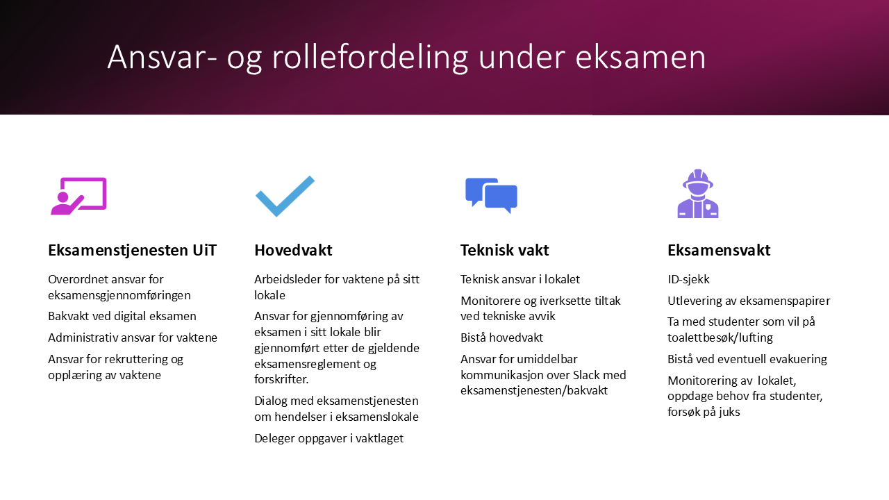 - Annet forefallende eksamensrelatert arbeid – tekniske vakter skal hjelpe de vanlige eksamensvaktene med deres oppgaver dersom det er behov og tid.