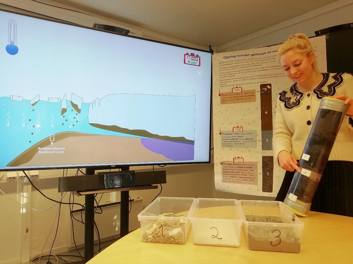 I år dro vi heller ut til jentene på Tromsdalen og Kongsbakken VGS for å gi dem et innblikk i hva maringeologer jobber med. Vi lot dem studere sedimenter hentet opp fra havbunnen, og jentene klarte med det å rekonstruere fortidens klima. De fikk også studere 3D-modeller av to typer foraminifera, en mikroorganisme med et skall som består av kalk. Oppgavene elevene utførte var basert på et opplegg laget av flere stipendiater ved instituttet under Geologiens Dag i fjor høst.