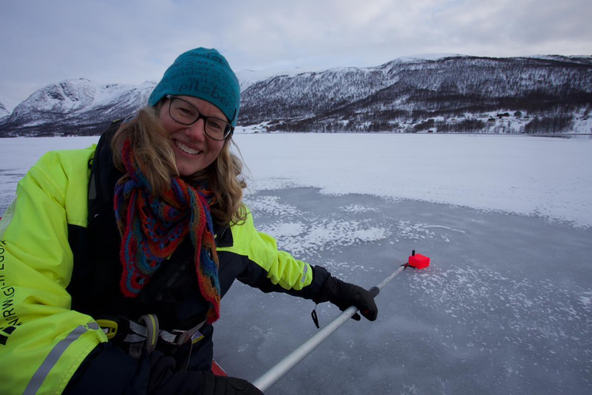 På kvelden 1. mai var forsker Malin Johansson fra UiT ute i Ramfjorden i gummibåt. Der plasserte hun ut et instrument som skal kunne fortelle oss hvordan den tynne isen beveger seg. Utplasseringen av en sender er del av et lite prosjekt som kalles ThinTec – Thin Ice Measurement Technology.