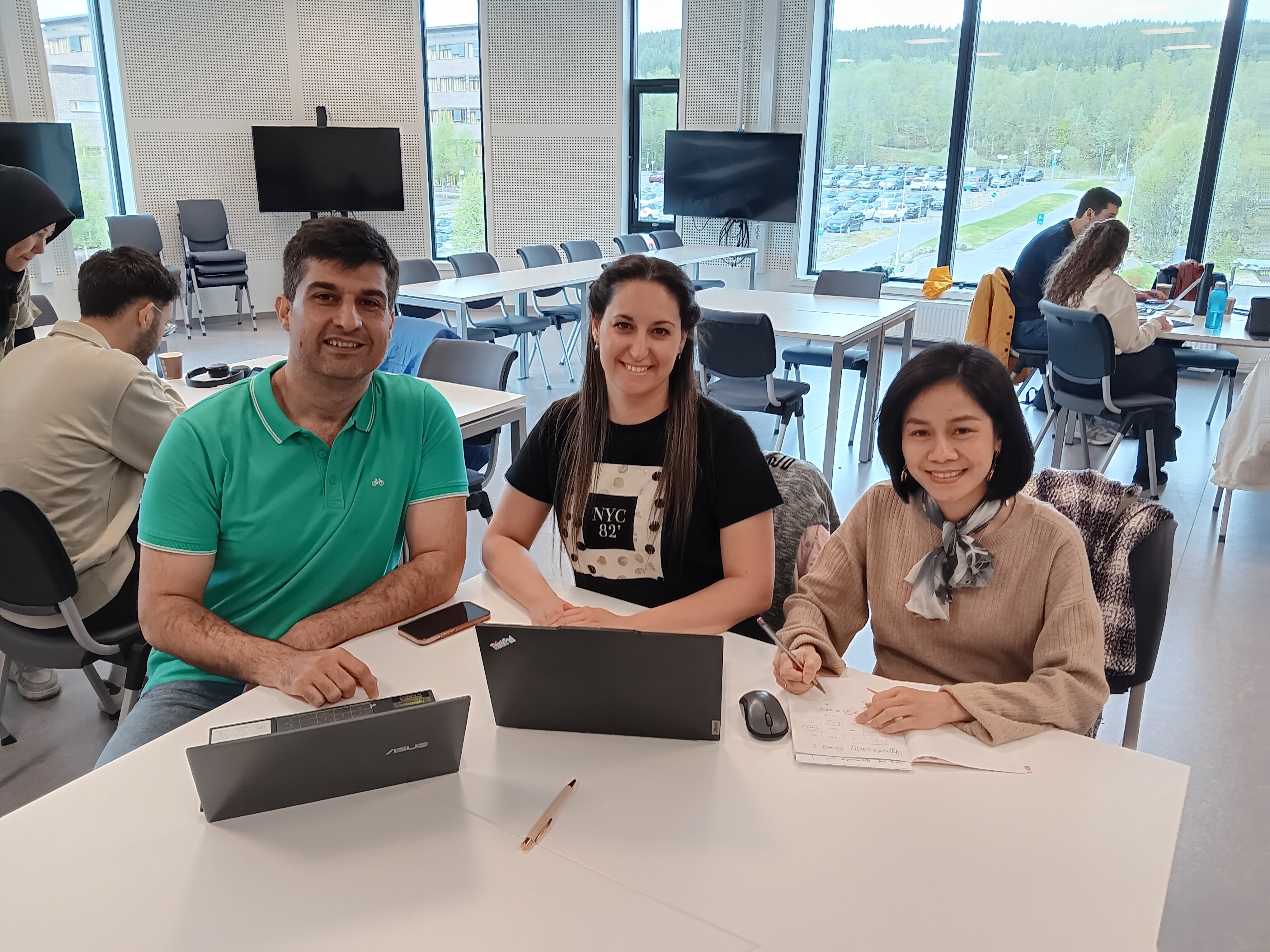 Utviklet konsept for nettside om stipender for studenter og akademikere fra Midtøsten: Sarkhel Akbar Mahmood (t.v.), Raquel Garcí-Donas Guerrero og Linh Tuyet Vuong. Foto: Kim Bredesen / UiT