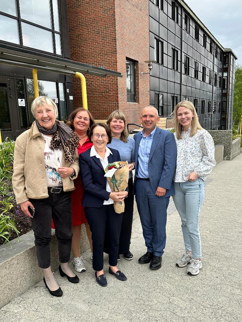 Annelise Fredriksen har hatt mange med seg i arbeidet med utdanningen. Fra venstre veilederne Berit Sivertsen Sørvig, Veronica Lorentzen og Toril Sørheim Nilsen, professor Simon Peter Neumer og veileder Ane Sætrum. Underviser, professor Kristin Martinsen, RBUP øst og sør (ikke på bildet) har også vært med i teamet. Foto: Mariann S. Karlsen/ UiT