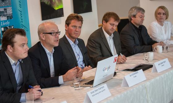Fv. byråd for næring, kultur og idrett Jonas Stein Eilertsen, direktør i Google Norge Jan Grønbech, ordfører Jens Johan Hjort, byrådsleder Øyvind Hilmarsen, instituttleder ved Handelshøgskolen i Tromsø Derek Clark og prosjektleder Liv-Inge Resvoll. Foto: Mark Ledingham, Tromsø kommune