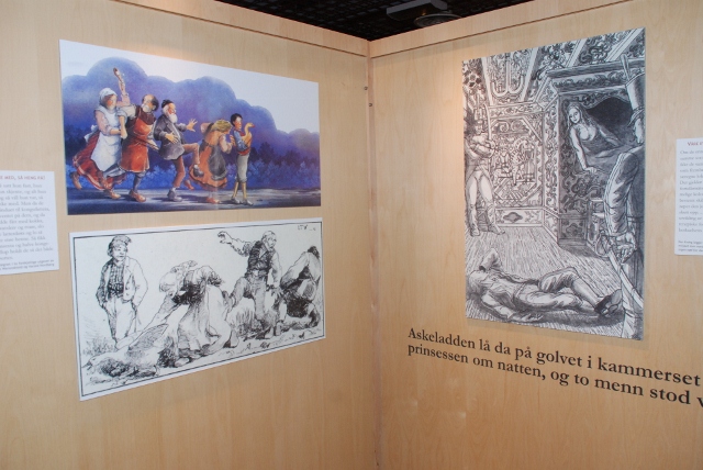 Utstillinga på UB syner mellom anna fram mange av dei fargerike illustrasjoanne som følgjer eventyrutgåvene. Alle foto: Sigrun Høgetveit Berg
