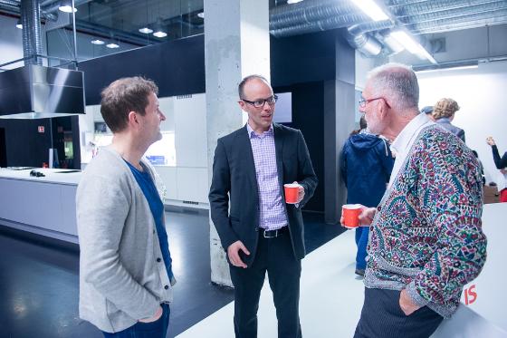 | Mack-direktør Harald Bredrup og dekan Kjell Magne Mælen i samtale med Sigurd Stray fra Eiendomsspar som har vært prosjektleder for bygget. Stray mener bygget ble bedre enn de kunne drømme om. |