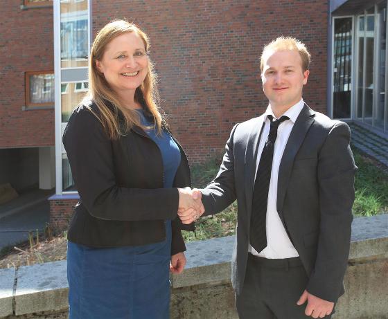 | Daniel Selnes Sortland gratuleres med beste masteroppgave i 2013 av prodekan for utdanning, Inger Johann Lurås |