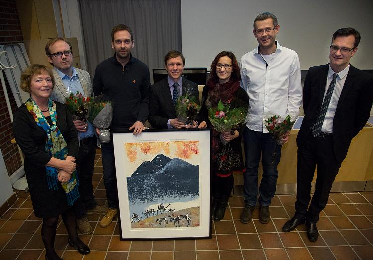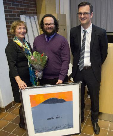 | Årets forskningspris gikk til professor i spansk språkvitenskap Antonio Fábregas, her sammen med dekan Sonni Olsen og fakultetsdirektør Jørgen Fossland. Foto: Stig Brøndbo |