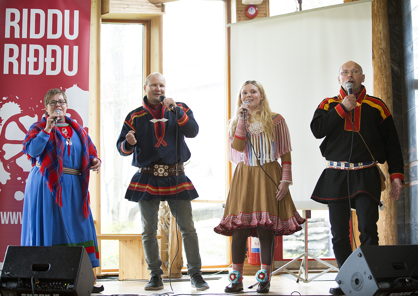 | Charlotte Kappfjell, Lars-Ánte Kuhmunen, Ingá Máret Gaup-Jussu og Øystein Nilsen presenterte smakebiter fra et joikebestillingsverk som skal fremføres under årets festival. Foto: Stig Brøndbo |