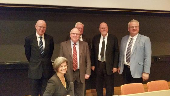| Bakerst fra v.: Høyesterettsdommer Henrik Bull, førstelagmann Arild Eidesen, Danmarks tidligere dommer i Den europeiske menneskerettighetsdomstolen Peer Lorenzen, EFTA-domstolens president Carl Baudenbacher, Islands EFTA-dommer Pàll Hreinsson. Foran: Professor Giuditta Cordero-Moss. Foto: Jussi Pedersen |