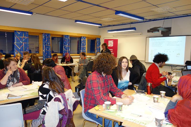 Studenter i arbeid med å finne nye produktforslag til Davvi Siida, under ledelse av Nina Danielsen fra Ungt Entreprenørskap Finnmark.