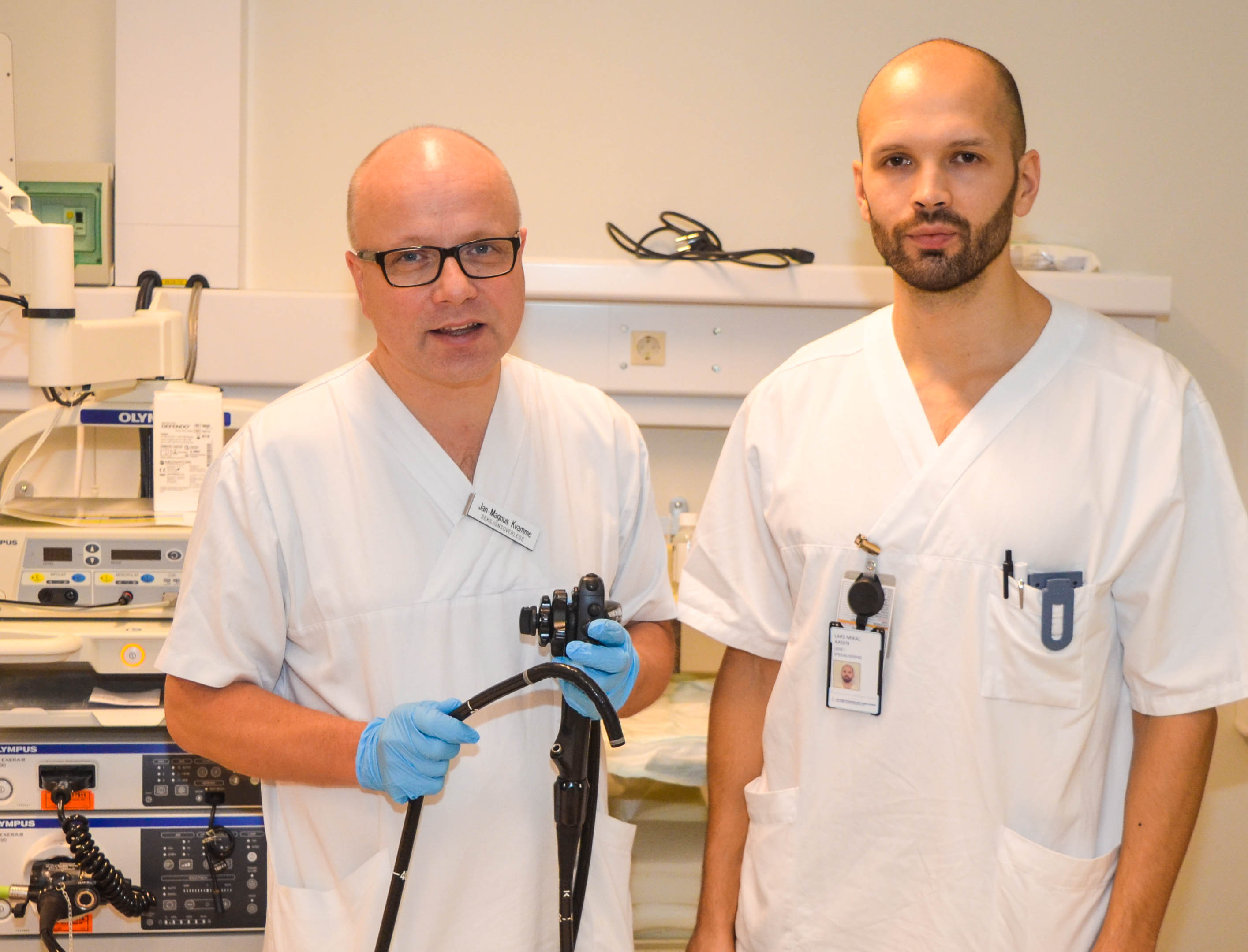 | 10 norske sykehus deltar i tarmpolyppstudien. I tillegg vil studien gjennomføres i Nederland, Polen, Sverige og Spania. Her med forskerne fra Tromsø, Jan-Mangus Kvamme og Lars Mikal Aasen. Foto: UNN. |
