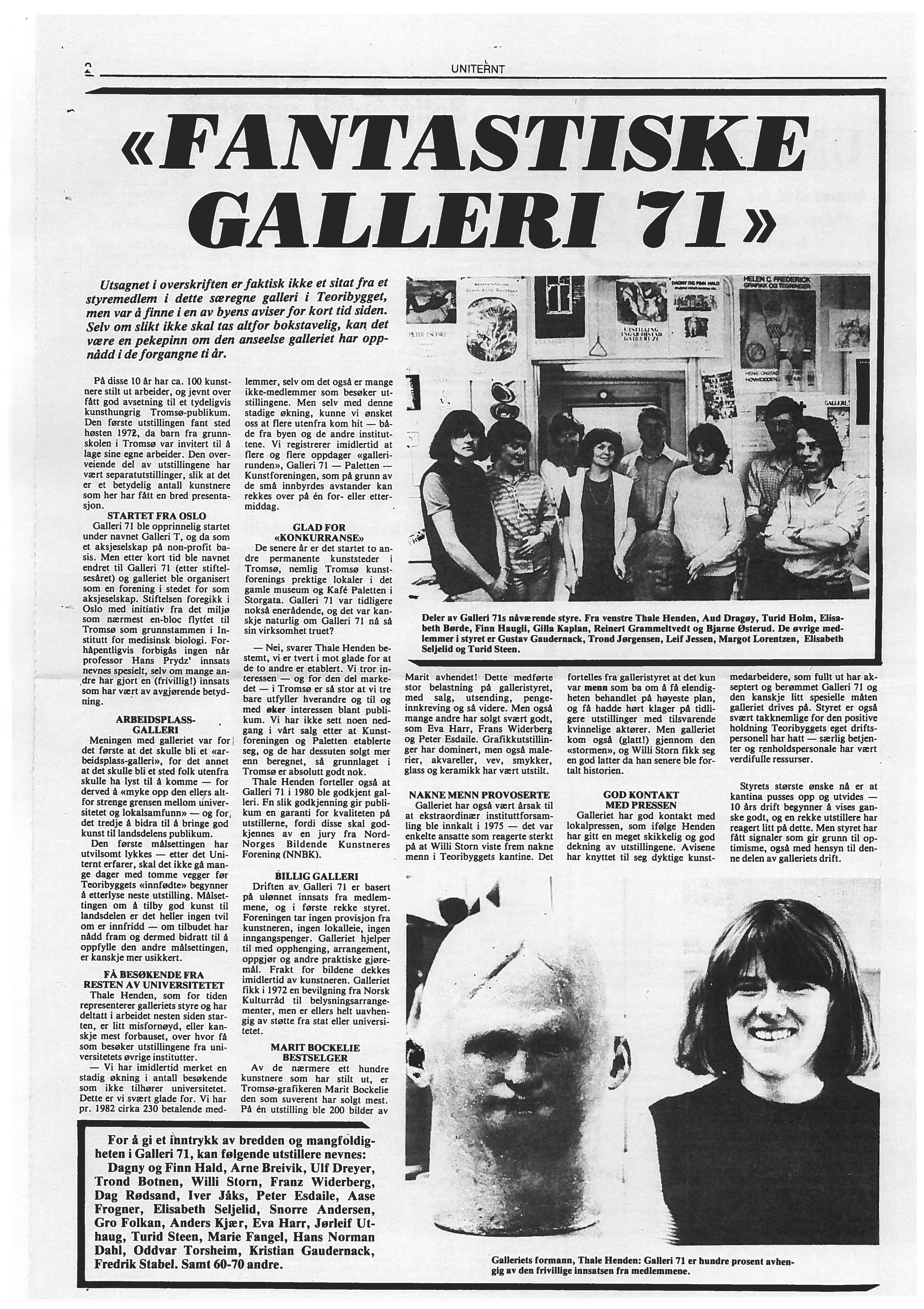 De tidligere UiT-ansatte Thale Henden og Elisabeth Seljelid var begge aktive i arbeidet med Galleri 71. Jeg møter dem på Thales siste arbeidsdag ved UiT, og får høre historier om fornøyde kunstnere, stor dugnadsånd og nakne menn, for å nevne noe: