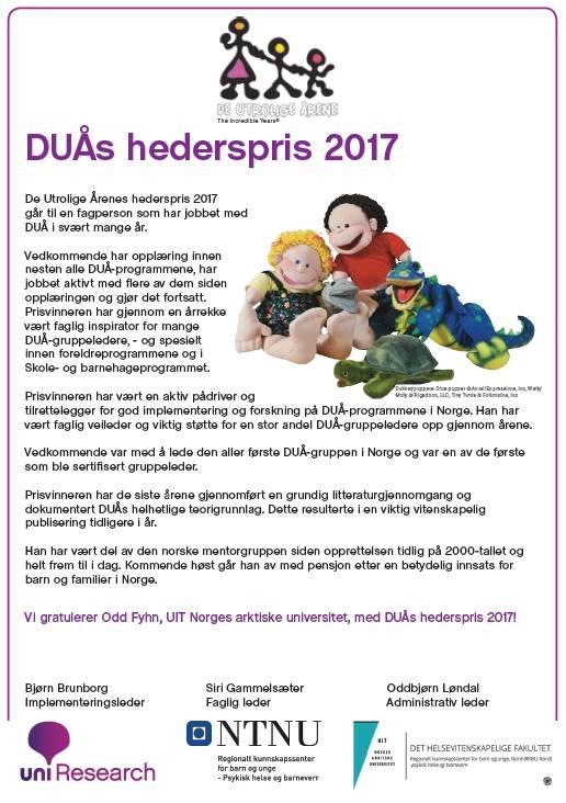 Fyhn har opplæring i nesten hele programserien til DUÅ, har jobbet aktivt med programmene og driver fortsatt med opplæring. Bakgrunnen for prisen er blant annet at Fyhn gjennom en årrekke har vært faglig inspirator for mange DUÅ-gruppeledere, han har vært aktiv pådriver og tilrettelegger for implementering og forskning på DUÅ-programmene i Norge. Han har også vært faglig veileder og en viktig støtte for en stor andel av DUÅ-gruppeledere gjennom årene.