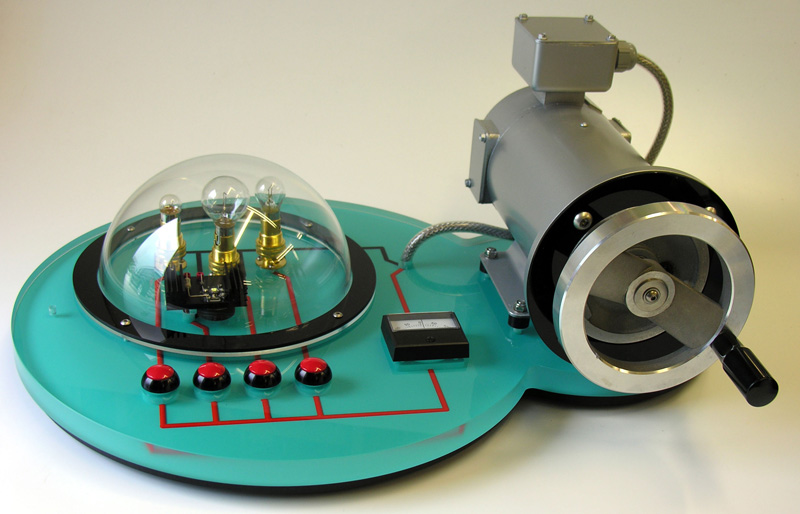 Når du føler deg ferdig med vindkraft, kan du skape kraft selv. En generator med håndsveiv sørger for det. Sveiv på sveiva og trykk ned en eller flere av de røde knappene, og kjenn hvordan kraften du trenger for å sveive, endrer seg. Energien som går med til å få lysene til å lyse, kommer fra deg, og det trengs mer energi for å få to lamper til å lyse enn en. Et amperemeter viser hvor mye strøm som brukes.