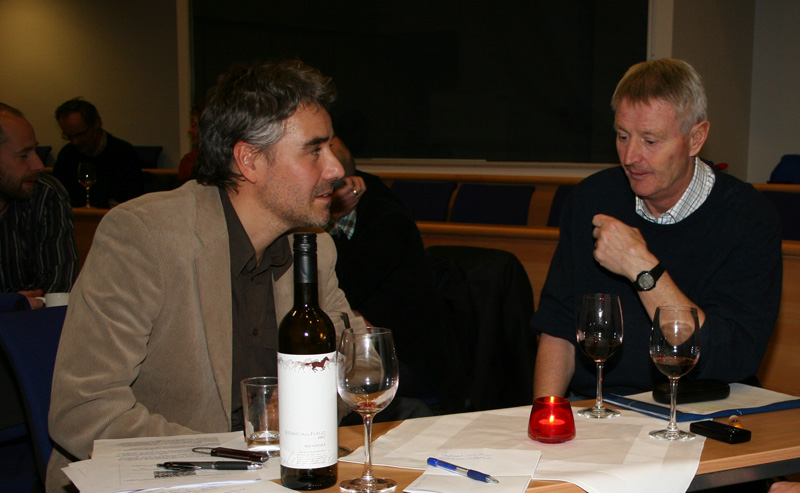 Historiker Steinar Aas og fotballegende Terje Skarsfjord diskuterer nordnorsk fotball under Historisk forenings rødvinsseminar. Foto: Thoralf Fagertun |