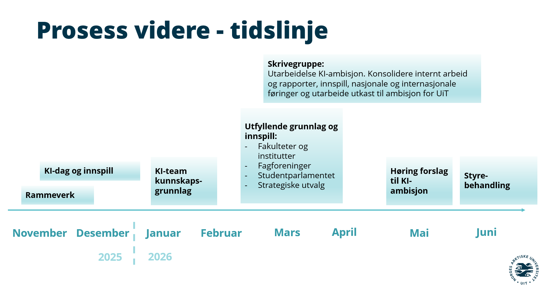 Basert på en ytterligere runde med innspill knyttet til de utarbeidede rapportene og spørsmålene over, vil det utarbeides et utkast til en KI-ambisjon for UiT. Denne vil sendes på høring og det siktes på behandling i universitetsstyret i juni 2026.