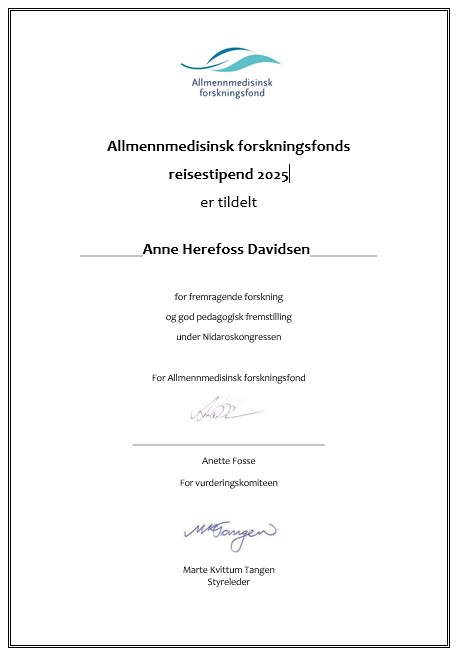 Anne Herefoss Davidsen, fastlege i Alta og ph.d.-stipendiat ved AFE Nord fikk på Nidaroskongressens Forskningsdag tildelt forskningsprisen, et reisestipend fra Allmennmedisinsk Forskningsfond.