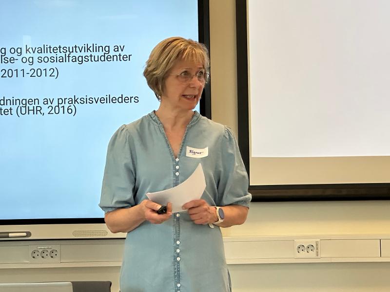 Dagen startet med at prosjektleder Rigmor Furu, førstelektor ved HelPed, Helsefak UiT, informerte om prosjektet VeiKomp Nord - Veiledningskompetanse for en bærekraftig helsetjeneste i Nord-Norge (2023-2028), og hva som var status. VeiKomp Nord fikk prosjektmidler fra HK-dir, Ordning for fleksibel og desentralisert utdanning, i 2023.