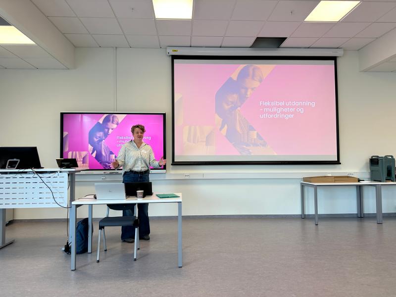 Karin Brennholm, seiorrådgiver i HK-dir, hadde en presentasjon om Fleksibilitet i utdanning. Karin satte fokus på fleksibilitesbegrepet og dens ulike dimensjoner; i forhold til tid, sted, omfang, progresjon, vurdering, formalisering, samhandling og innhold. Hun snakket også om fleksibilitetens muligheter og utfordringer.