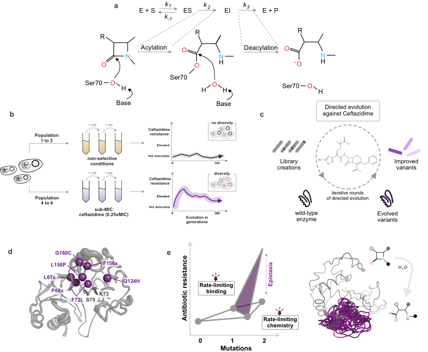 (a) illustrates the general reaction mechanism of serine β-lactamases, enzymes that hydrolyze β-lactam antibiotics and confer resistance. To explore their evolutionary potential, we use a combination of long-term experimental evolution (b) and directed evolution approaches (c), enabling us to investigate how these enzymes adapt under different selective pressures. To uncover the molecular mechanisms driving these adaptations, our group integrates structural biology (d) and biochemistry (e). This interdisciplinary strategy allows us to link changes in enzyme sequence and structure to their functional consequences, shedding light on how resistance evolves and how it might be counteracted.