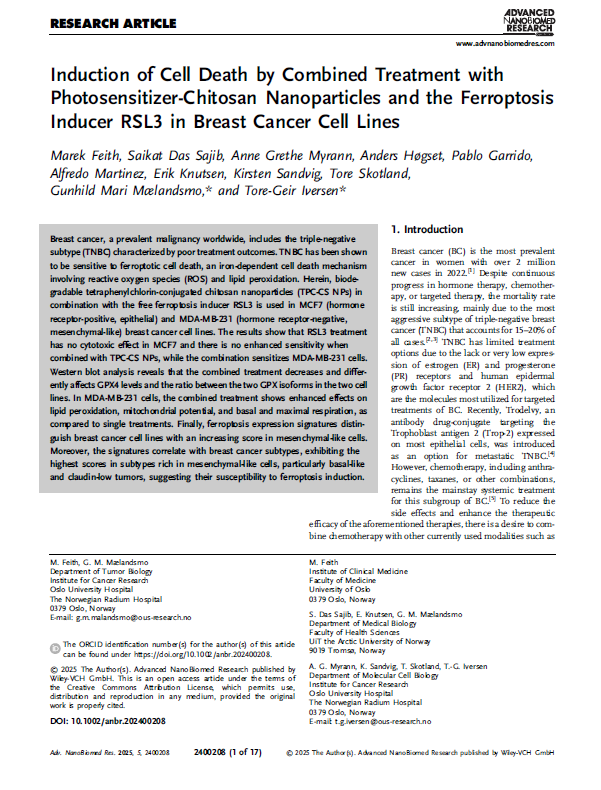 Feith, M., Sajib, S.D., Myrann, A.G., Høgset, A., Garrido, P., Martinez, A., Knutsen, E., Sandvig, K., Skotland, T., Mælandsmo, G.M. & Iversen, T.-G. (2025) Induction of Cell Death by Combined Treatment with Photosensitizer-Chitosan Nanoparticles and the Ferroptosis Inducer RSL3 in Breast Cancer Cell Lines Advanced NanoBiomed Research, Volume 5. 2025 |