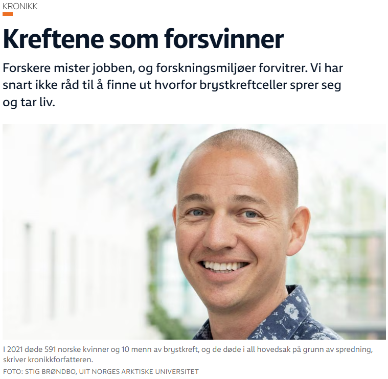 Kreftene som forsvinner«Forskere mister jobben, og forskningsmiljøer forvitrer. Vi har snart ikke råd til å finne ut hvorfor brystkreftceller sprer seg og tar liv.» |