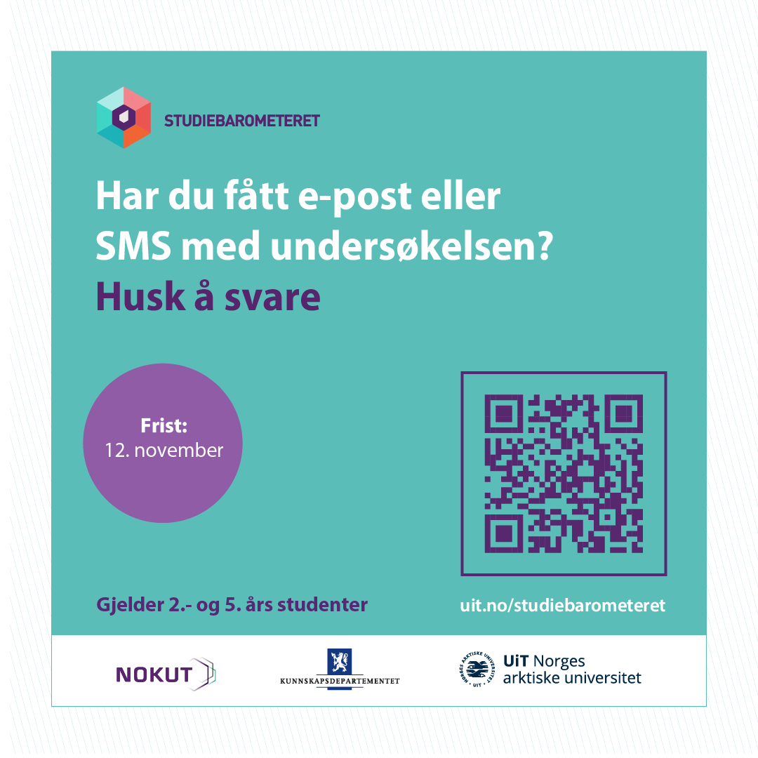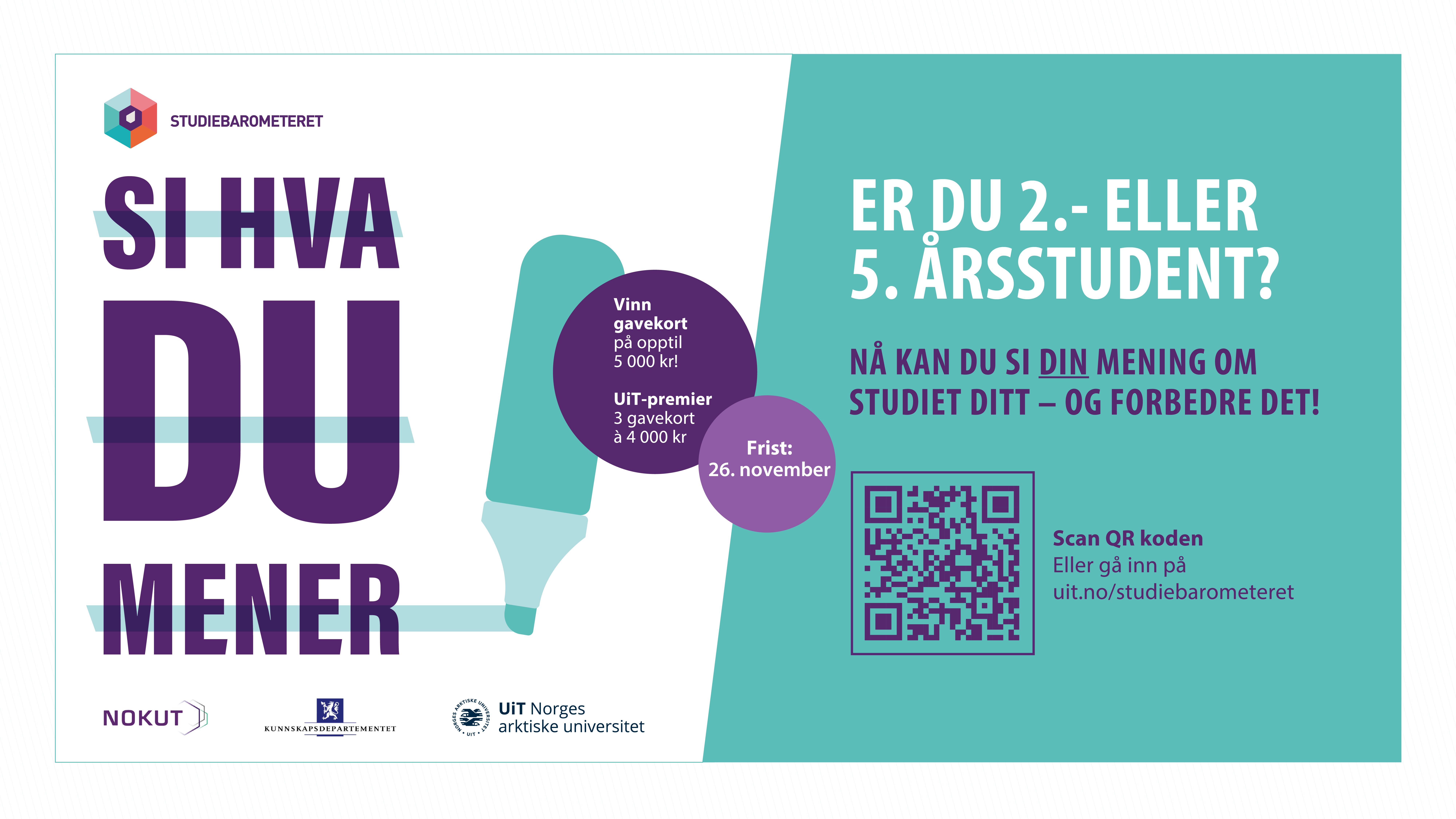 22. oktober til 24. november var alle landets 2. og 5. årsstudenter invitert til å delta i undersøkelsen Studiebarometeret. Undersøkelsen gir studenter mulighet til å gi tilbakemelding på studieprogrammene sine, og svarene deres er verdifulle for UiT. Hva UiT-studentene svarte, kan du lese om på Studiebarometerets nettside.