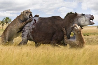 | Smilodoner angriper en Toxodon. Illustrasjon: Prehistoric Park Wiki |