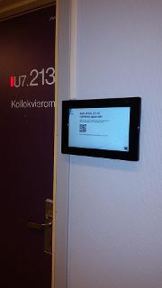 Ved fire av grupperommene på MH-bygget, plan 7, er det montert skjermer som viser timeplan og informasjon om hvordan rommene reserveres.