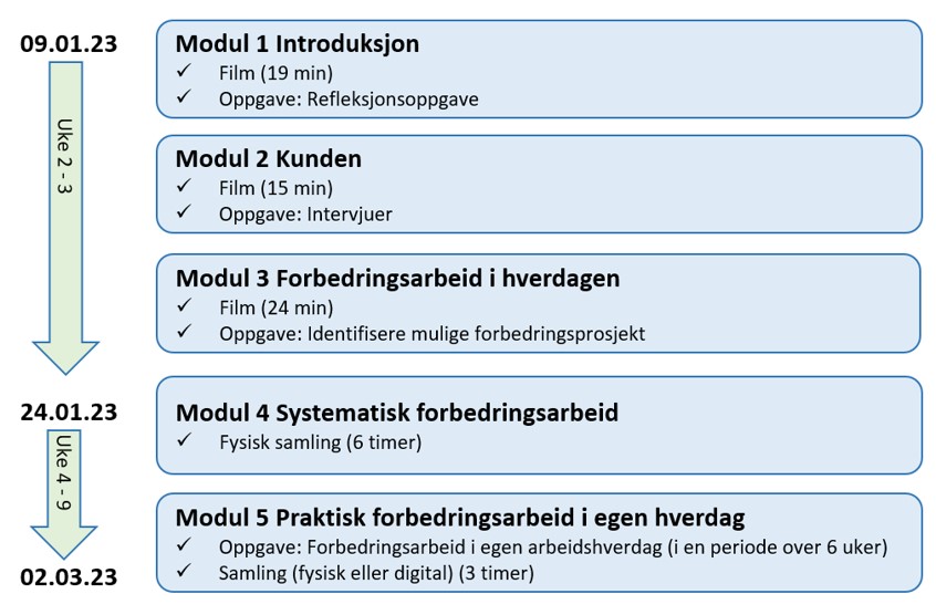 De tre første modulene er digitale og kan gjennomføres når det passer deg selv best (asynkront) innen en periode på 2 uker. Modul 4 gjennomføres som fysisk samling. Evt. reisekostnader må dekkes av egen enhet. I modul 5 vil du jobbe med et forbedringsarbeid fra din egen arbeidshverdag med støtte og veiledning fra kursdeltakere og arrangør. Det er viktig at du vurderer om du faktisk har tid å delta på kurset da det krever at du har tid til å gjennomføre et lite forbedringsprosjekt i egen hverdag.