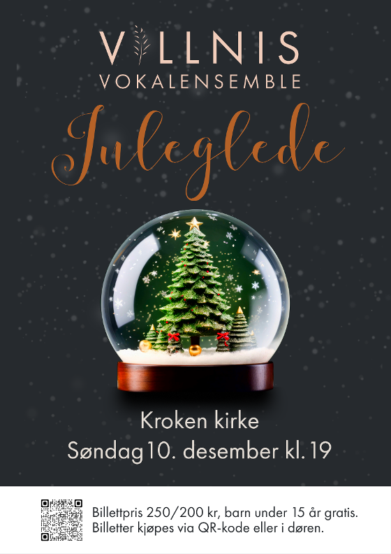 Villnis Vokalensemble inviterer til julekonsert i Kroken Kirke søndag 10. desember klokken 19.00. Her vil du få høre de gode, gamle sangene som gir deg julestemning, pakket inn i nydelige harmonier arrangert for vokalensemble. Vi gleder oss til å synge for deg!