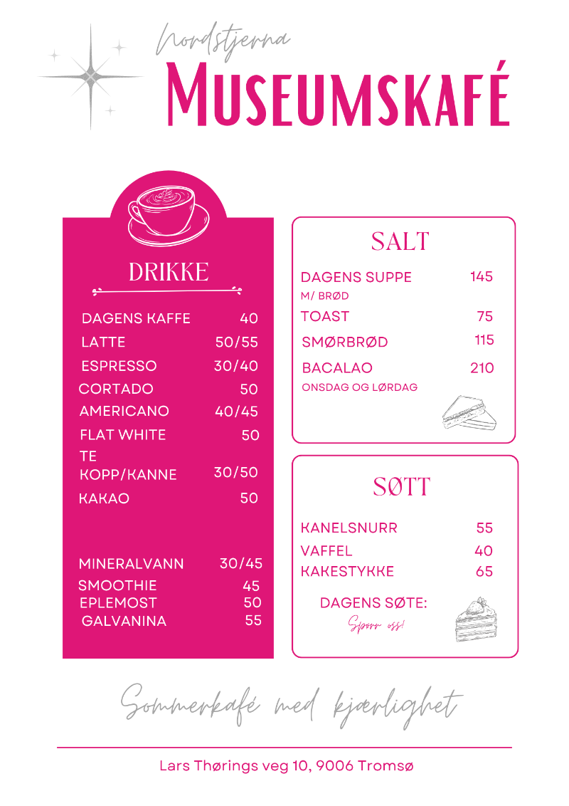 Nordstjerna er en pop-up sommerkafé med hjemmelaget søtt og salt, god kaffe, te og is. Du finner oss på Norges arktiske universitetsmuseum på Sør-Tromsøya.