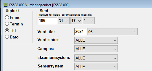 Velg Tid under Utplukk. Legg deretter inn 186 for UiT og fakultets- og instituttnummer (her 31 - Helsefak og 17 - IHO). Ved Vurd.tid setter du inn år og deretter vurderingstid. For kont/utsatt i høstsemesteret gjelder 08UK og 08U.