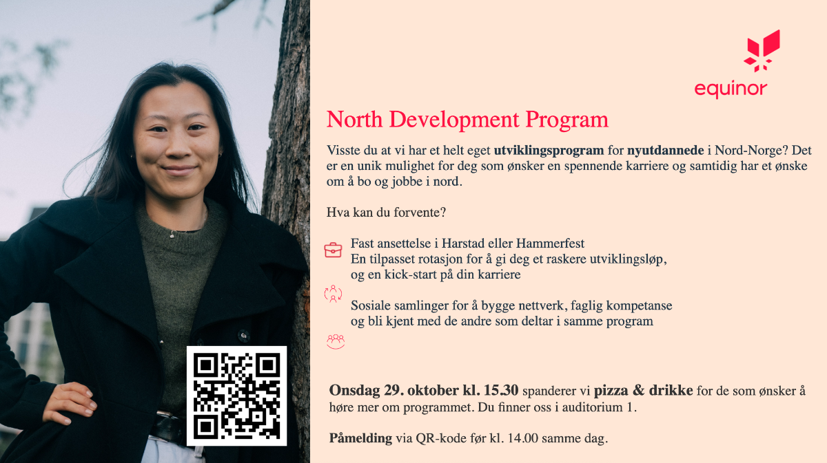 Onsdag 29. oktober kl. 15:30 kan du møte Equinor til bedriftspresentasjon og få vite mer om deres utviklingsprogram for nyutdannede i Nord-Norge. Equinor byr på gratis pizza og drikke til alle studenter. OBS! Påmelding.