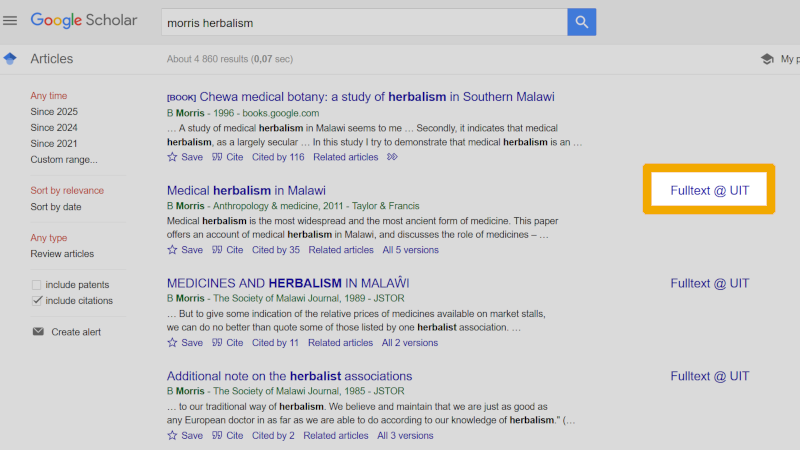 You can now search and read the resources the University Library has access to – these are labelled as Fulltext @ UIT. Click on the link to access the article.