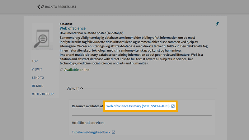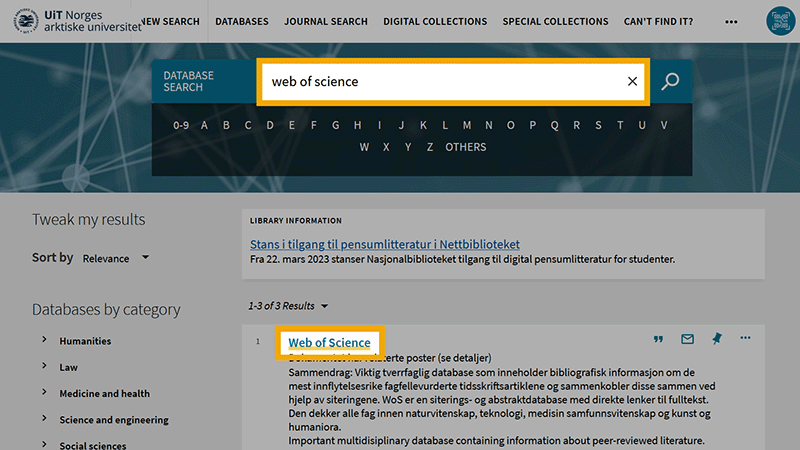 In addition to databases specific to each academic field, the University Library also offers access to the interdisciplinary Web of Science database. The Web of Science database is well-suited to issues that span different subjects and academic fields, as well as acting as a supplement to databases specific to academic fields. One of the main strengths of the database is that it includes a wealth of reference data; including information about which documents reference other documents.