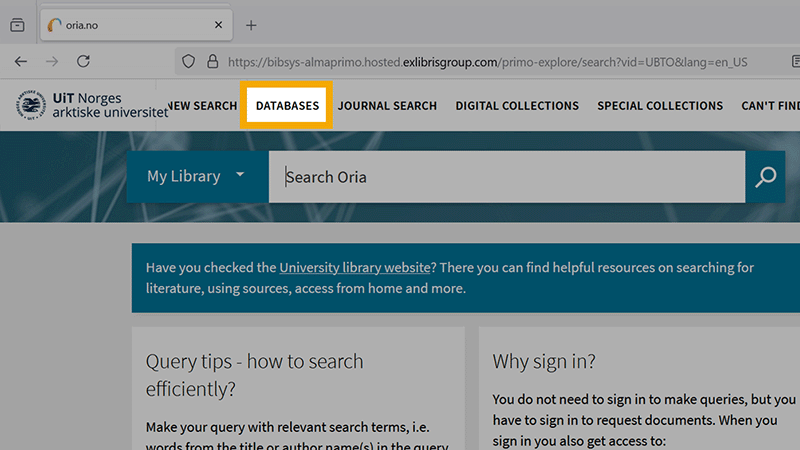 To ensure access to our databases, you should look them up in Oria. Use the tab "Databases" as illustrated below.